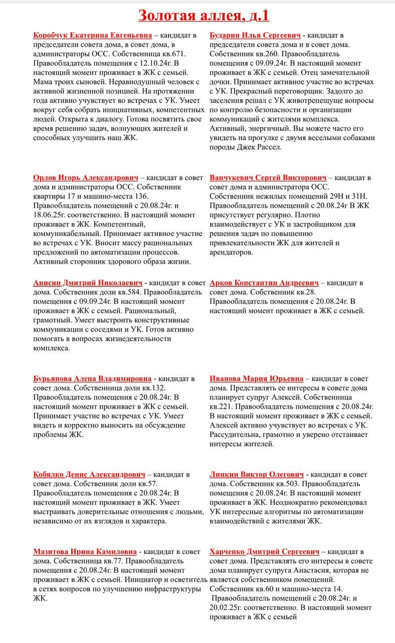На голосование вынесены кандидатуры 12-ти собственников помещений дома 1 и 6-ти собственников помещений дома 2.